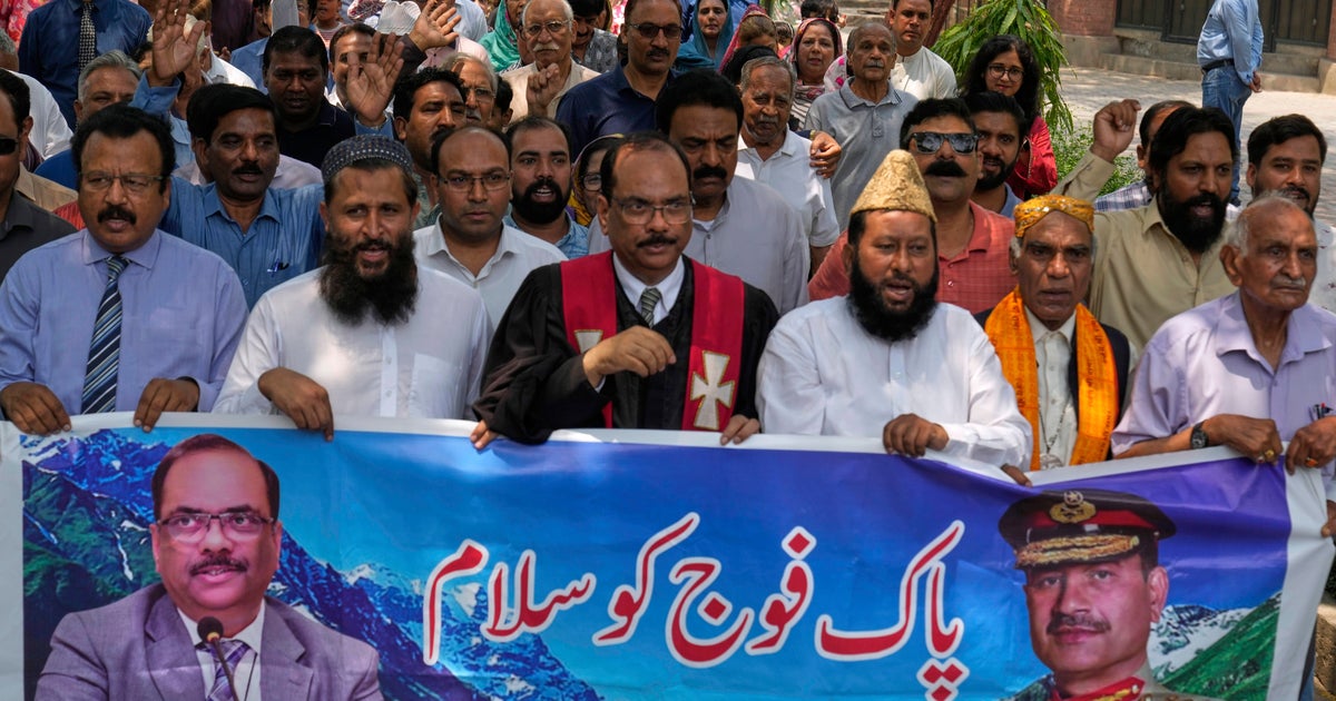 People from Christian and Muslim communities hold a demonstration to show their support with Pakistan Army, a day after the ceasefire between Indian and Pakistan, in Lahore, Pakistan, Sunday, May 11, 2025.