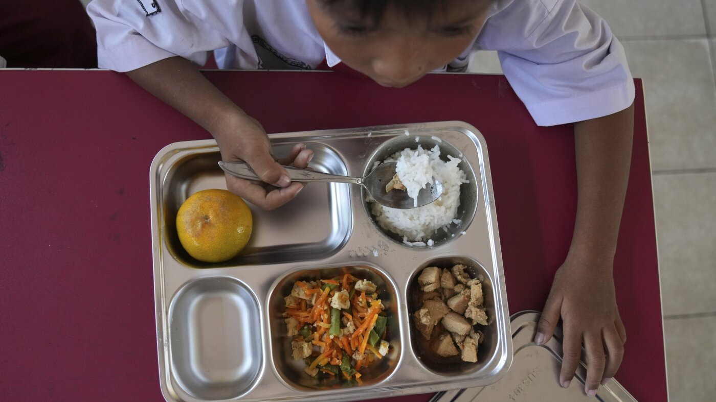 A student has his meal during the kick off of President Prabowo Subianto’s ambitious free meal program to feed children and pregnant women nationwide — despite critics saying that its required logistics could hurt Indonesia’s state finances and economy — at an elementary school in Depok, West Java, Indonesia, Monday, Jan. 6, 2025.