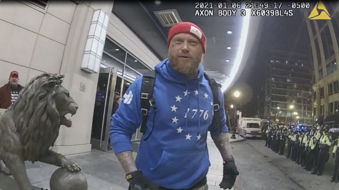 Shane Jenkins, seen here in police bodycam footage from Jan. 6, 2021, was convicted of multiple charges in connection with the Capitol riot, including assaulting police. Months after receiving a pardon from President Trump, Jenkins visited the White House along with another former Jan. 6 defendant.