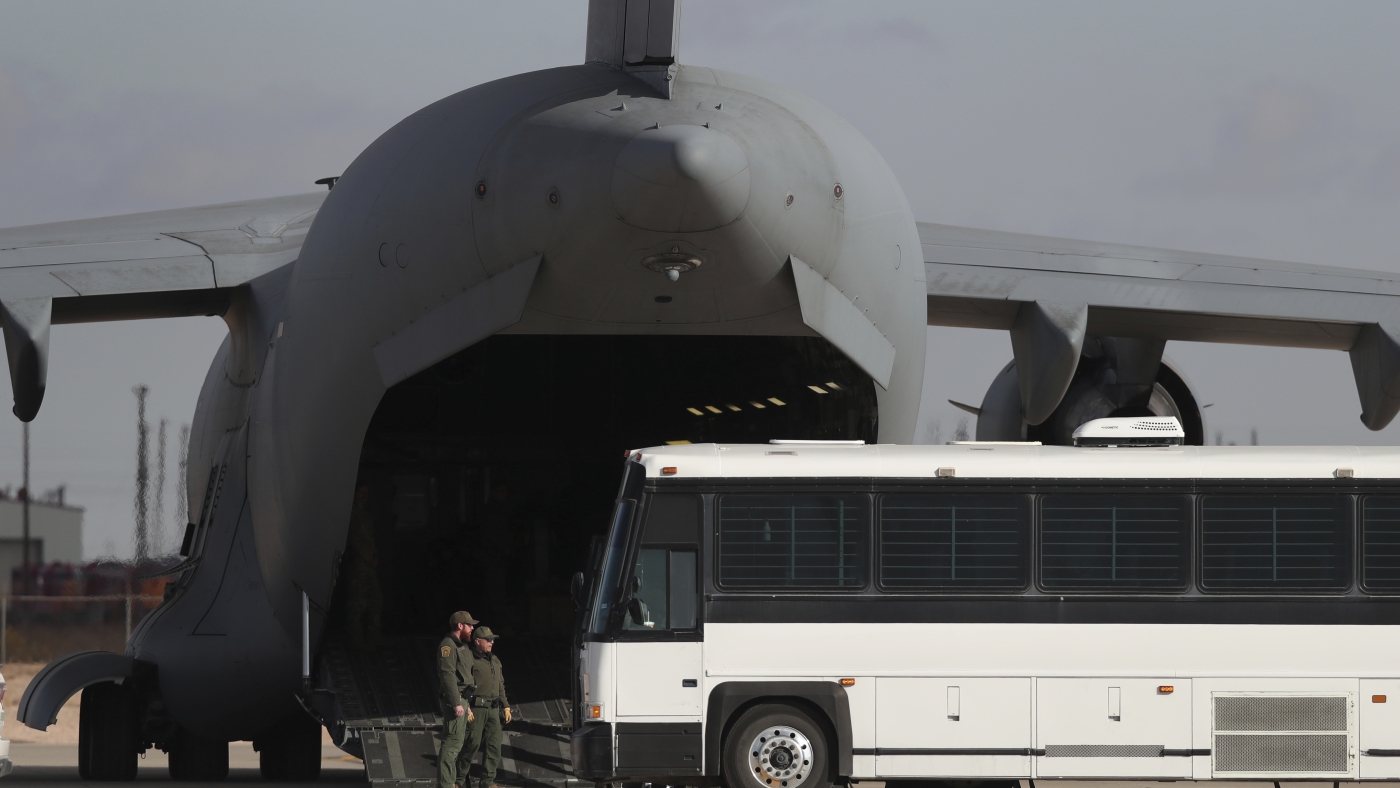 A military aircraft waits for migrants to board from a bus at Fort Bliss in El Paso, Tx., on Jan. 30, 2025, before deporting them to Guatemala.