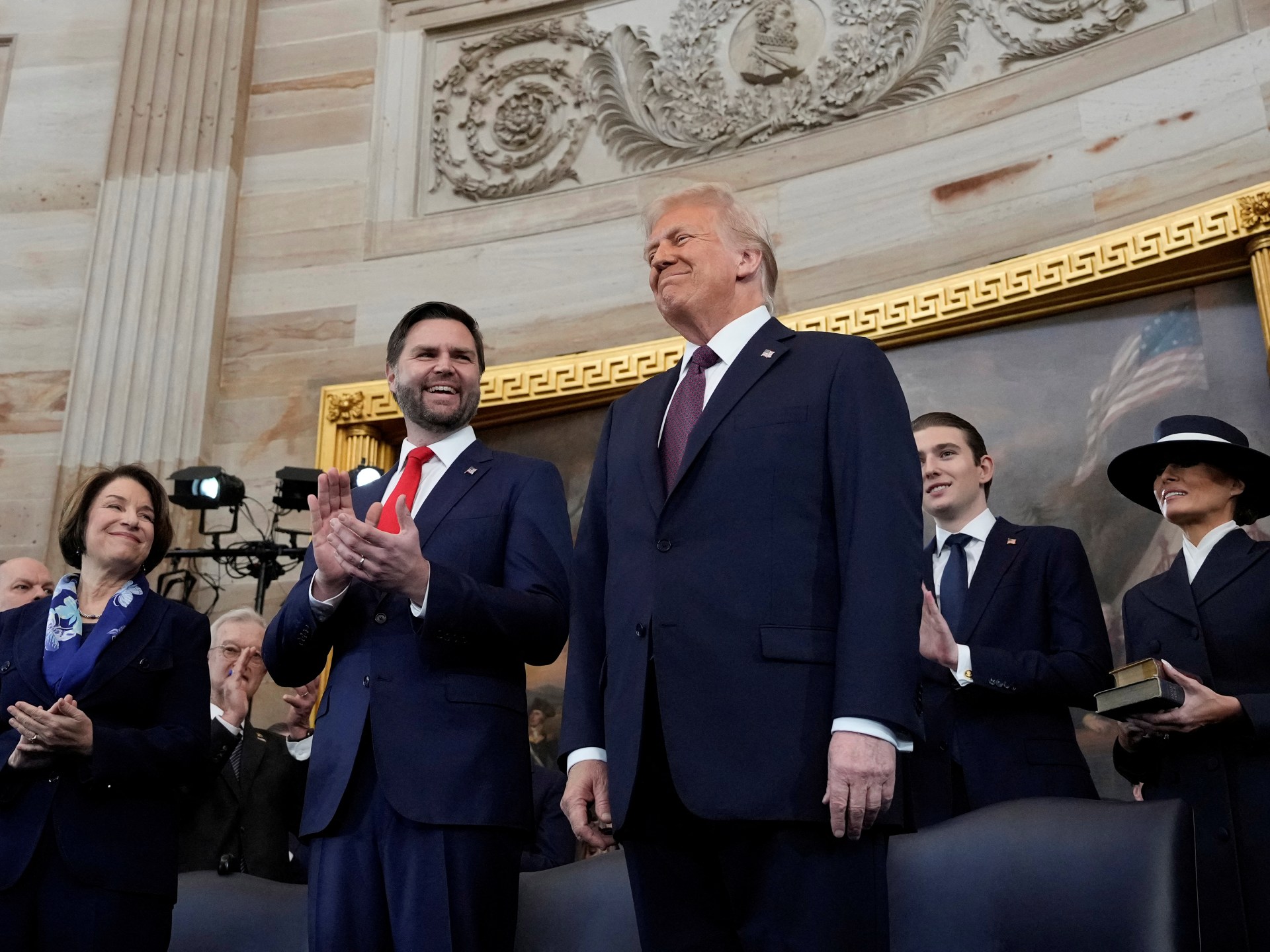 At noon Eastern time (17:00 GMT), Biden and three other former presidents — Bill Clinton, George W Bush and Barack Obama — piled into the Capitol rotunda with other dignitaries to witness Trump take his second oath of office.