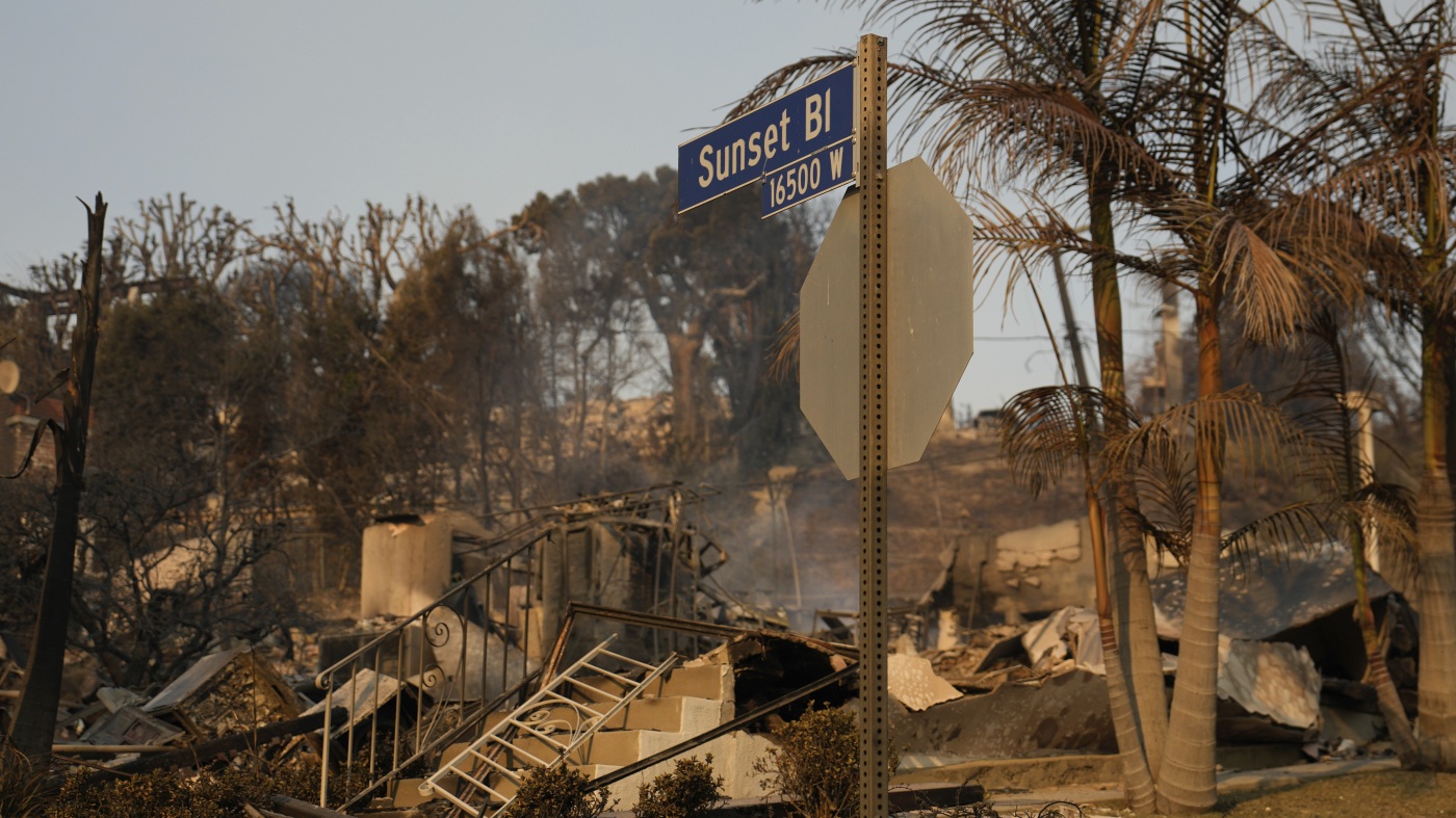 All that remains of a property on Sunset Boulevard in the Pacific Palisades neighborhood of Los Angeles, in a photo taken Friday, Jan. 10.