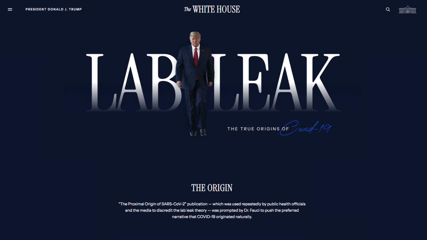 The White House has taken down some government websites providing COVID-19 information and replaced them with a new boldly styled page dedicated to the controversial theory that the pandemic was caused by the virus leaking from a Chinese government laboratory.