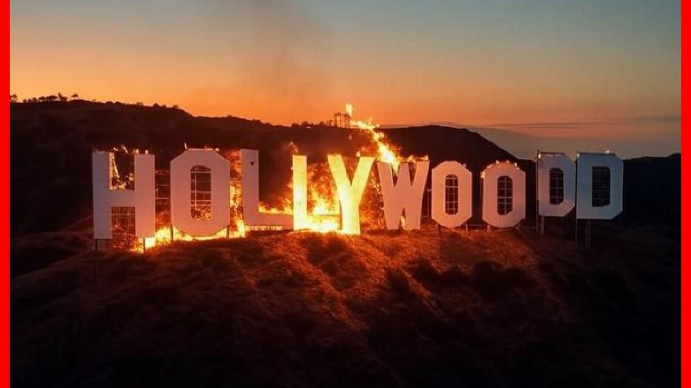 An AI-generated image depicting a fake Hollywood sign on fire. There is an extra D on the end of the sign.