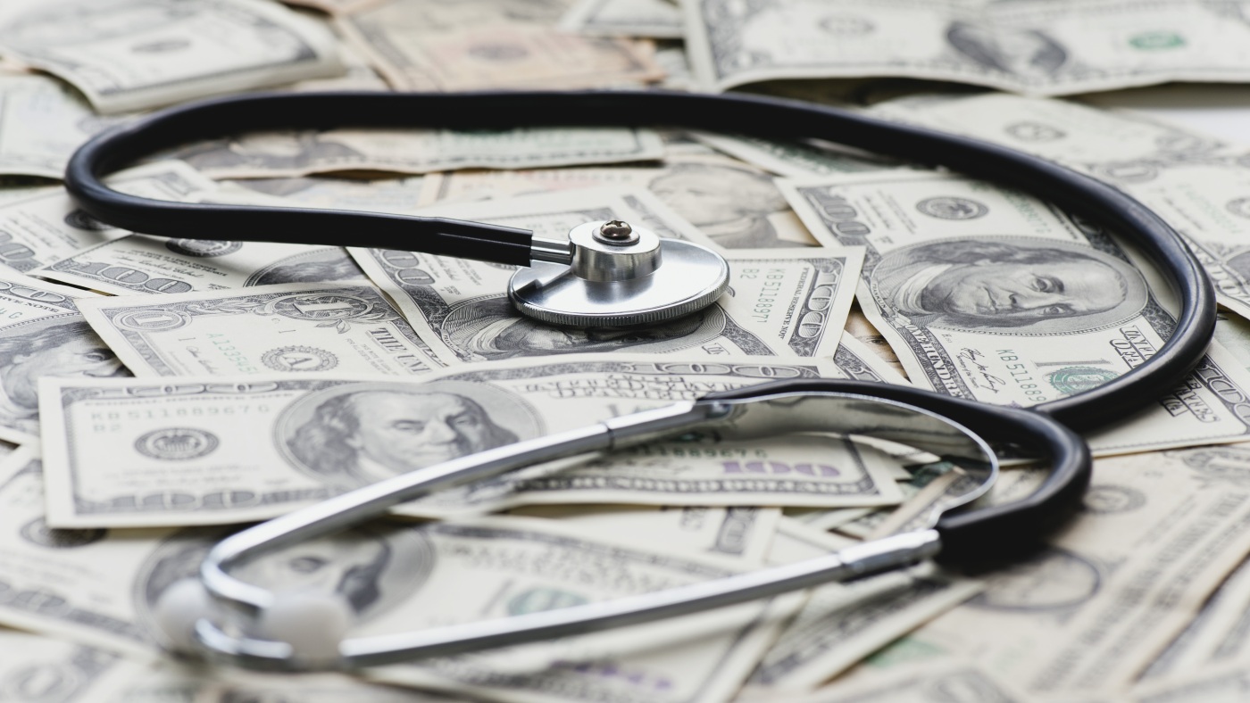 A stethoscope sits on a pile of U.S. bank notes.