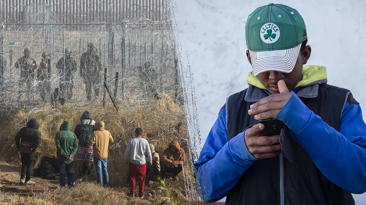 Migrants at the border and a migrant on a mobile phone