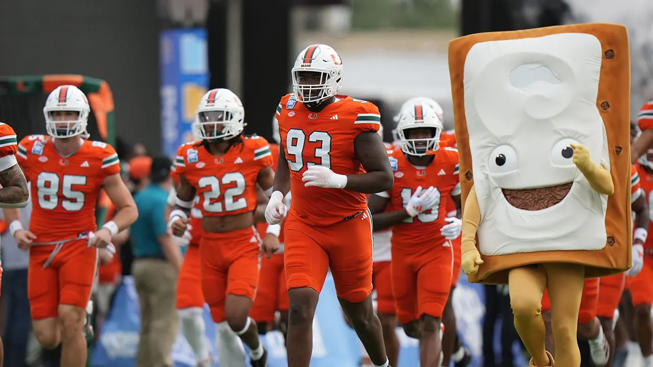 The Pop-Tart mascot runs onto the field with the Miami Hurricanes before the Pop-Tarts Bowl against the Iowa State Cyclones on Saturday, Dec. 28, 2024, at Camping World Stadium in Orlando, Florida. (Peter Joneleit/Icon Sportswire via Getty Images)