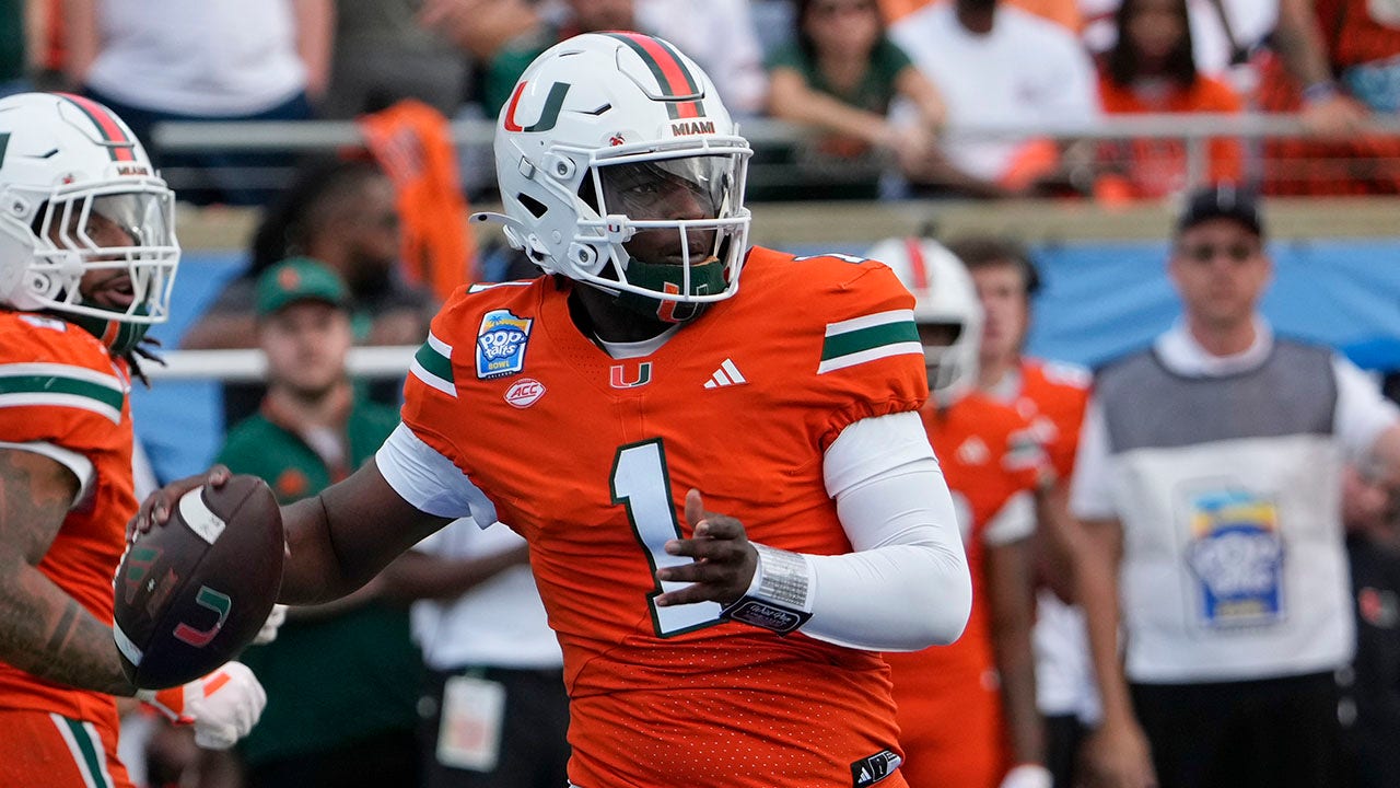 Miami quarterback Cam Ward (1) throws a pass during the first half of the Pop Tarts Bowl NCAA college football game against Iowa State, Saturday, Dec. 28, 2024, in Orlando, Florida. (AP Photo/John Raoux)