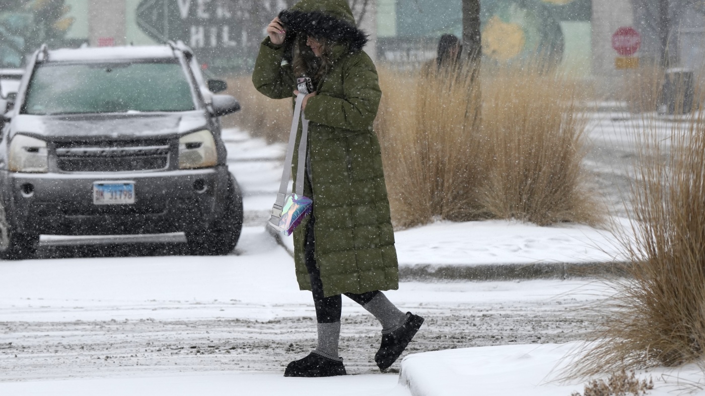 Pedestrian crosses the street during a snowy day in Vernon Hills, Ill., Wednesday, Feb. 12, 2025.