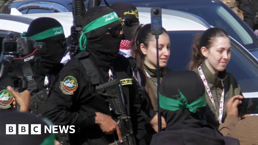 Video from Gaza City shows four Israeli prisoners being handed over by Hamas militants in a dramatic ceremony, and transferred to waiting Red Cross vehicles.