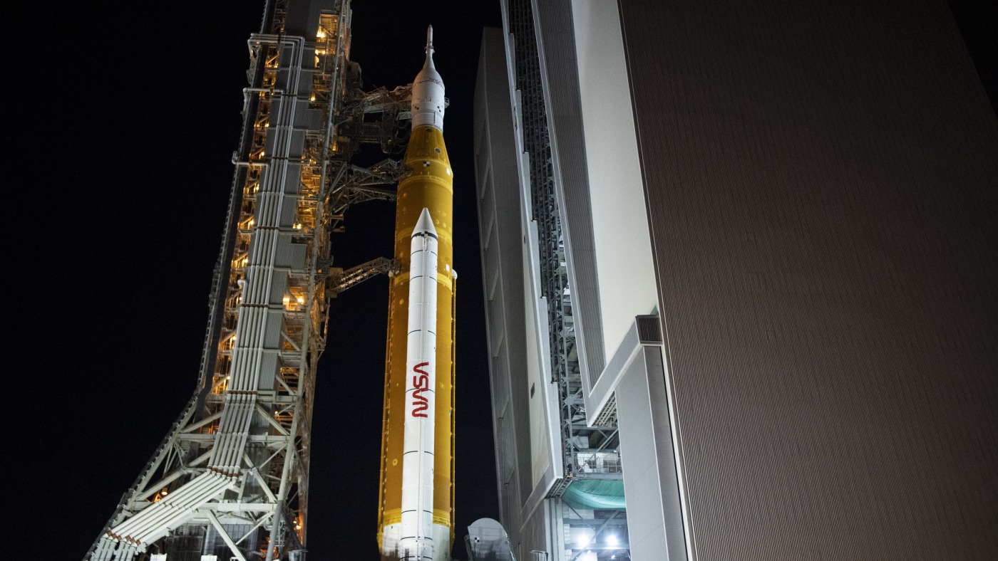 NASA’s Space Launch System (SLS) rocket, with the Orion spacecraft aboard the mobile launcher as it rolls out of the Vehicle Assembly Building to Launch Pad 39B, on Nov. 3, 2022, at Kennedy Space Center at Cape Canaveral, Fla., in preparation for a launch.