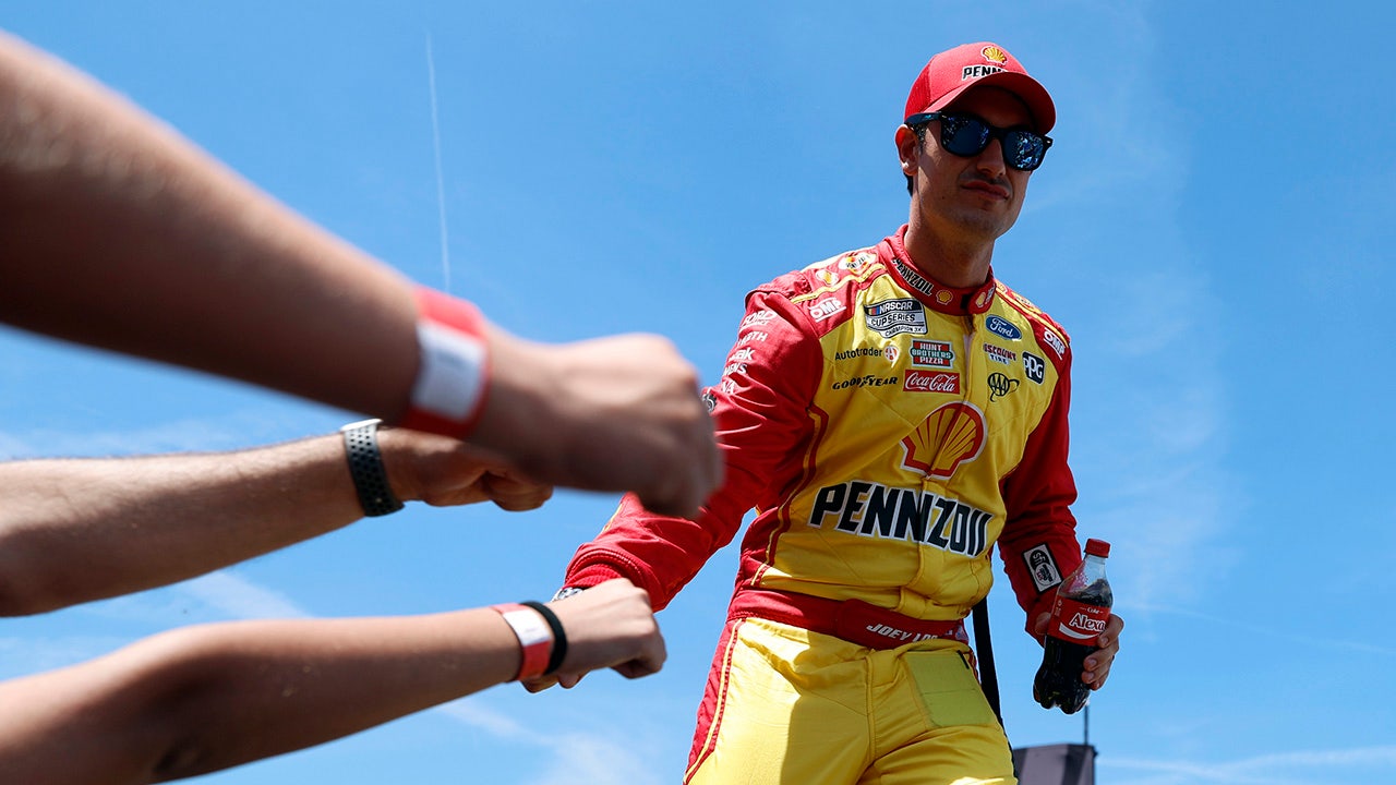 The driver Joey Logano greets the fans before the automatic race of the Nasscar Cup series in Talladga Superpeedway, on Sunday, April 27, 2025, in Talladega, Ala. (AP Photo/Butch dill)