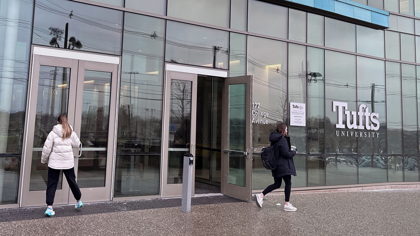 Two pedestrians walk on the campus of Tufts University on Jan. 31, 2025, in Medford, Mass., where an independent review stated a third-party instructor who led a strenuous training session for the school's lacrosse team appeared to lack credentials to supervise group exercise, which led to the hospitalization of some athletes.