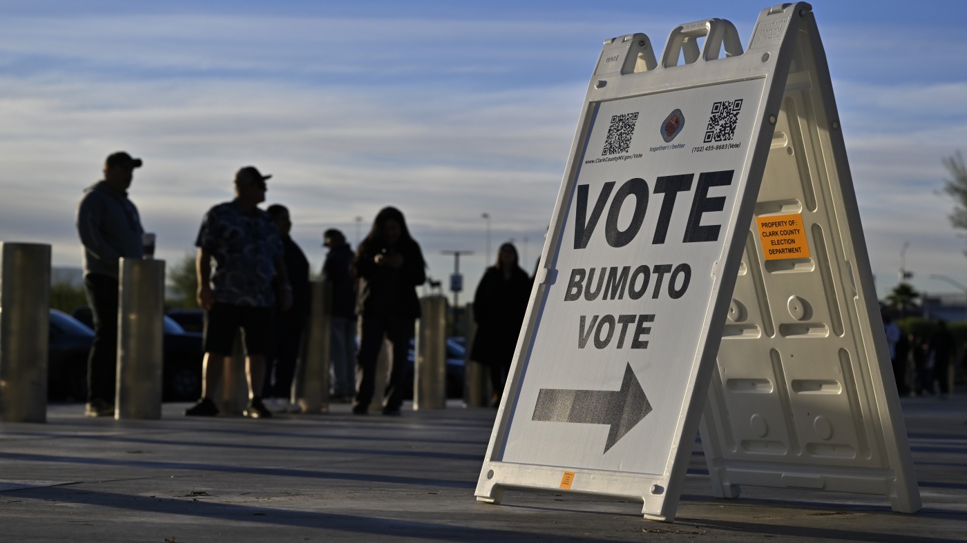 Voters line up to cast their ballots at Allegiant Stadium on Nov. 5, 2024 in Las Vegas, Nevada behind a sign reading "Vote, Bumoto, Vote" - directions in English, Tagalog and Spanish.