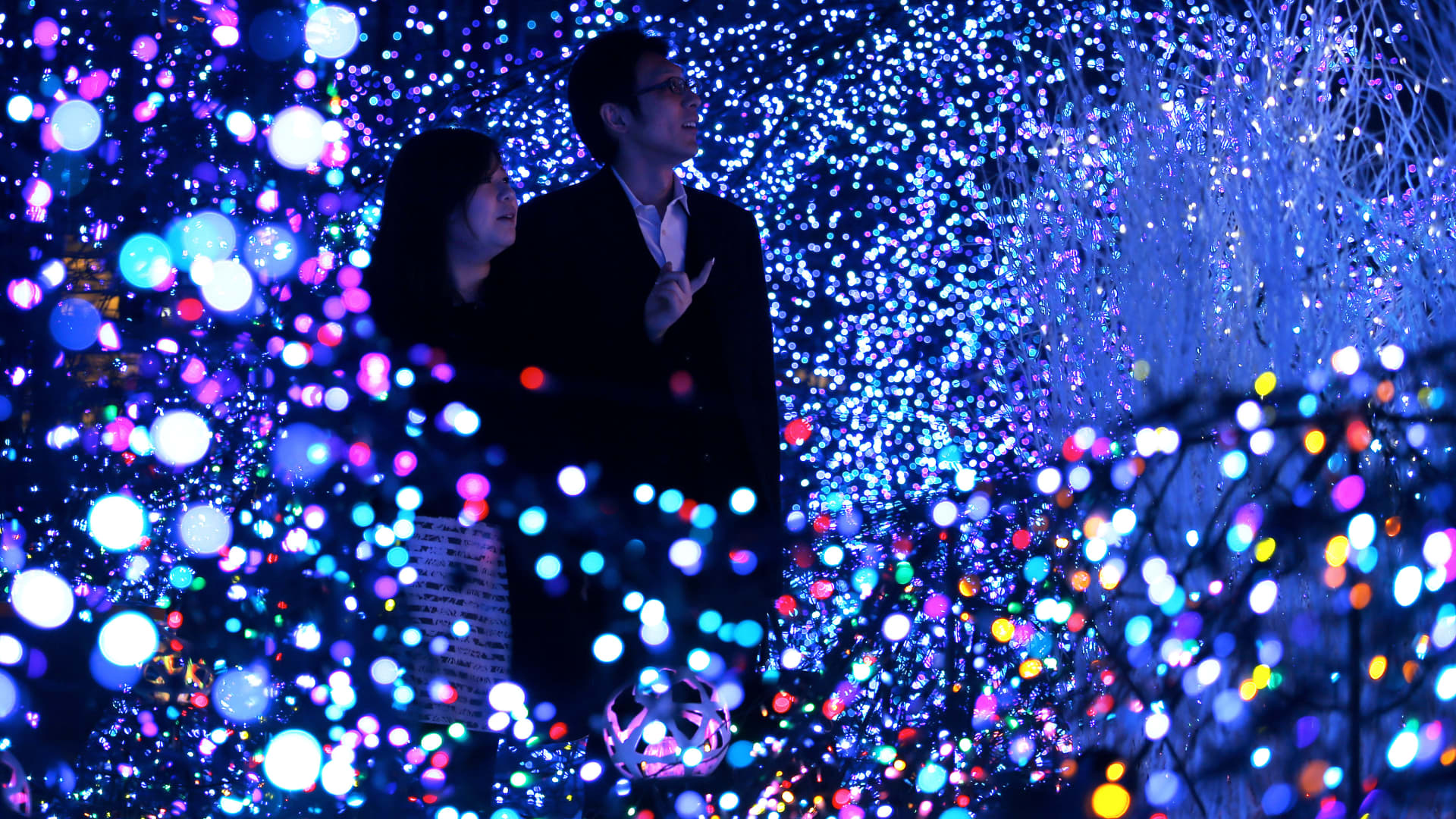 A couple looks at the lighting of light-emitting diodes before Christmas in Tokyo, Japan