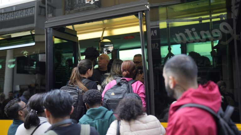 People try to board a crowded bus Monday after the subway stopped…