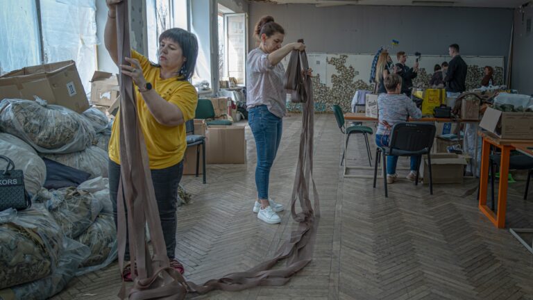 Displaced Ukrainians weave camouflage netting for the military in Zaporizhia Youth Center…