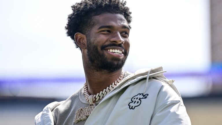 Former Colorado Buffaloes quarterback Shedeur Sanders looks on during a ceremony to…