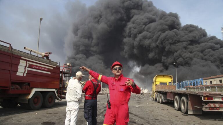 In this photo provided by Islamic Republic News Agency (IRNA), firefighters work…
