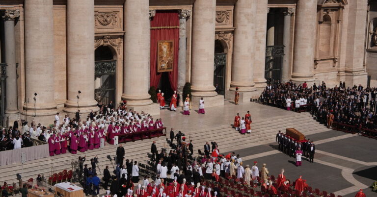 The coffin of Pope Francis is carried during the funeral Mass of…