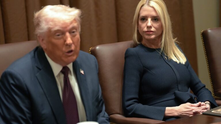 Attorney General Pam Bondi looks on as President Trump delivers remarks during…