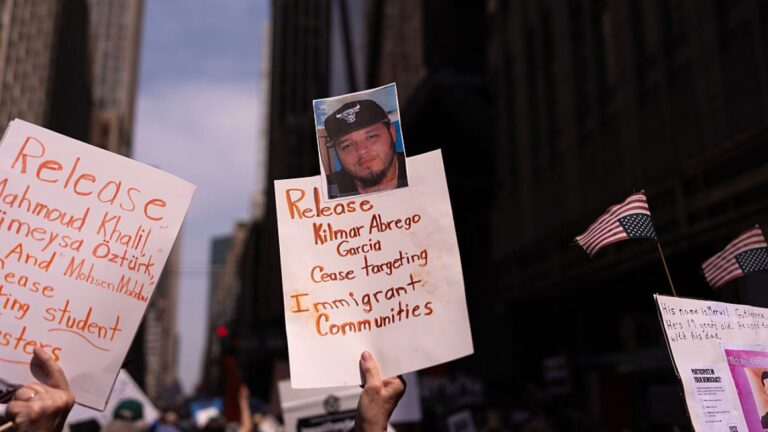 A person holds a sign with a photo of Kilmar Abrego Garcia…