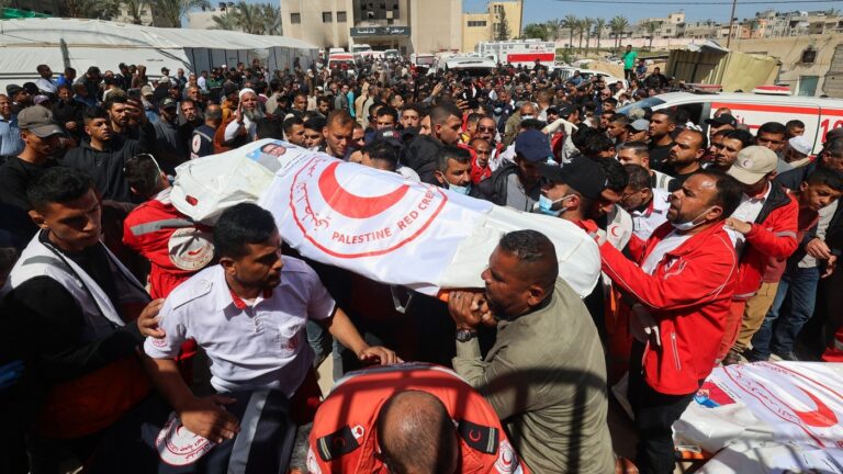 Members of the Palestine Red Crescent and other emergency services carry bodies…