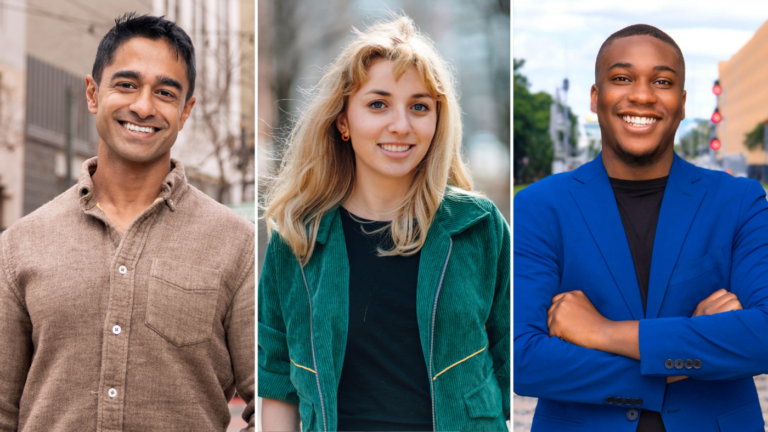 From left, Saikat Chakrabarti, Kat Abughazaleh and Elijah Manley are among a…