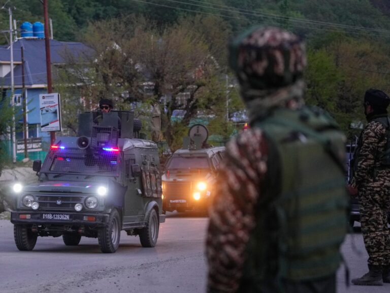 An Indian security officer patrols a shopping area in Pahalgam a day…