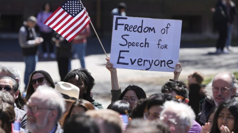 Students, faculty and members of the Harvard University community rally, Thursday, April…