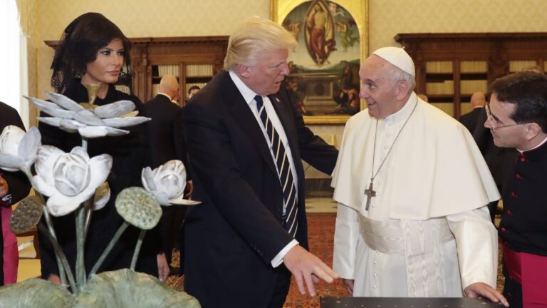 Pope Francis exchanges gifts with US President Donald Trump (C) and US…