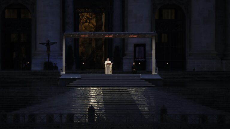 Pope Francis delivers the Urbi and Orbi prayer in an empty St.…
