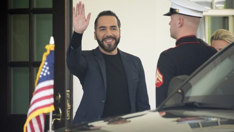 El Salvador’s President Nayib Bukele waves as he departs following a meeting…