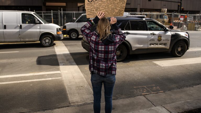 A Minneapolis Police cruiser drives by as people demonstrate outside the Hennepin…