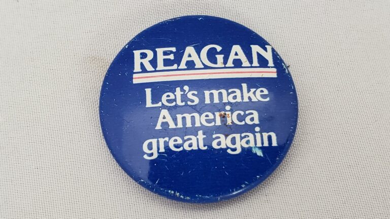 Close-up photo of pinback button with text reading Reagan, Let’s Make America…