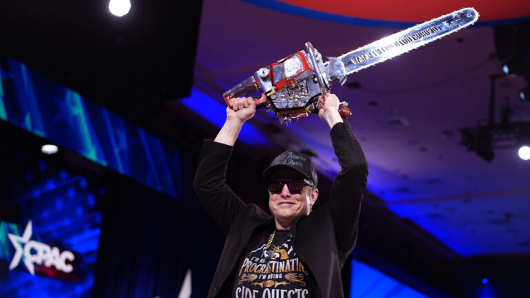 CEO of Tesla and SpaceX Elon Musk leaves the stage holding a…
