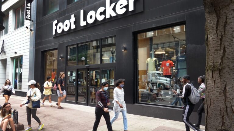 People walk by a Foot Locker store in Chicago. Scott Olson/Getty Images…