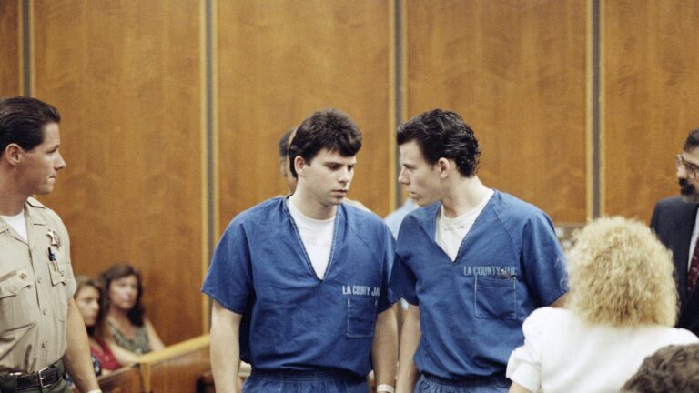 Lyle, left, and Erik Menendez leave the courtroom in Santa Monica, Calif.,…