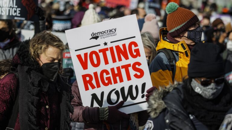 A demonstrator carrying a sign that says “VOTING RIGHTS NOW” walks across…