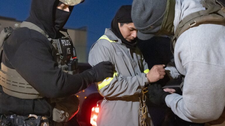 U.S. Immigration and Customs Enforcement officers use a chain to more comfortably…