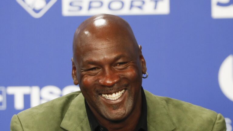 Basketball legend Michael Jordan speaks during a press conference ahead of an…