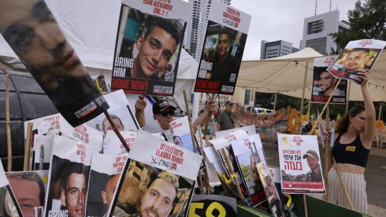 A woman holds a poster bearing a portrait of an Israeli hostage…