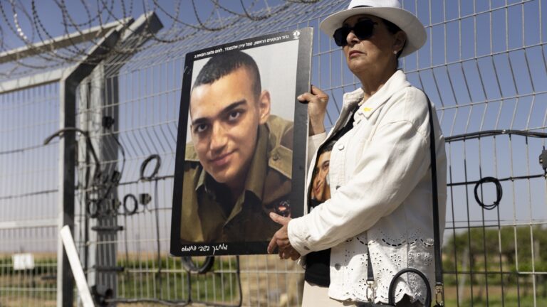Varda Ben Baruch holds a photo of her grandson Israeli American hostage…