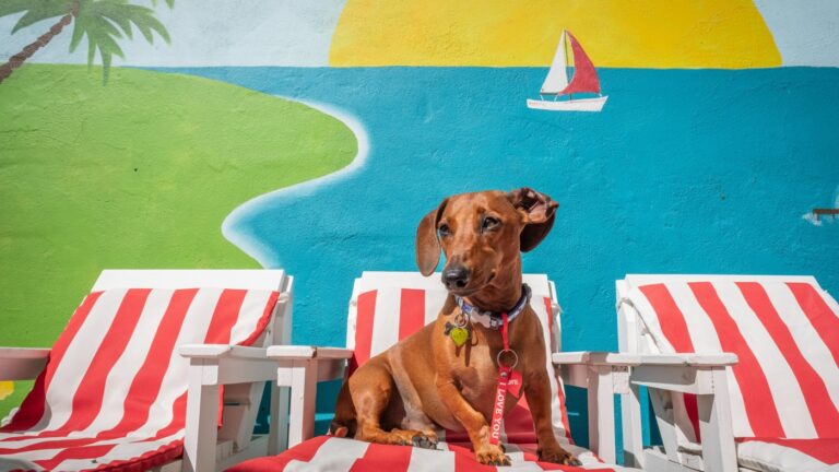 A Dashchund reclines on a miniature custom-made dog sun lounger beside the…