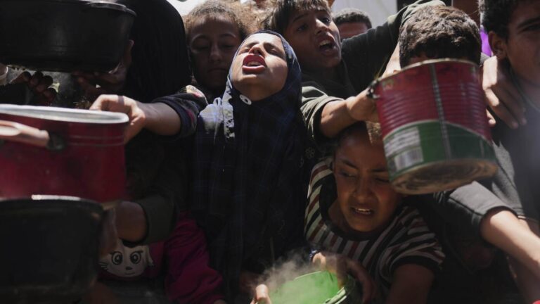 Palestinians struggle to get donated food at a community kitchen in Khan…