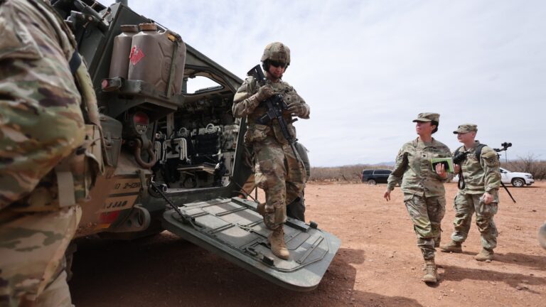 A Stryker platoon is stationed near the fence at the southern U.S.…
