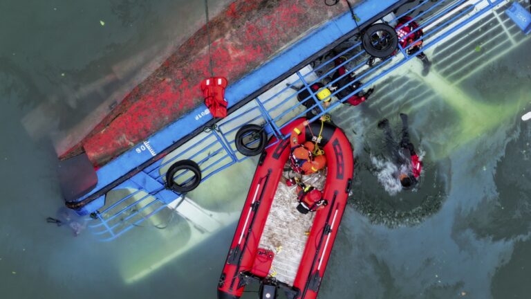 In this photo released by Xinhua News Agency, rescuers conduct a search…