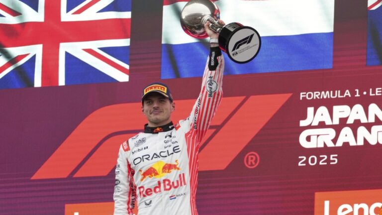 F1 driver Max Verstappen of the Netherlands raises his trophy after the…