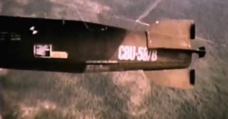 File A U.S. B-52 bomber drops cluster bombs on Laos during the…
