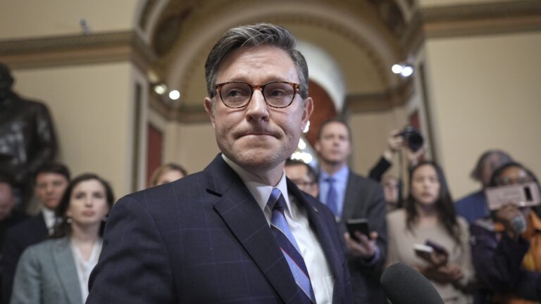 Speaker of the House Mike Johnson, R-La., talks to reporters just after…
